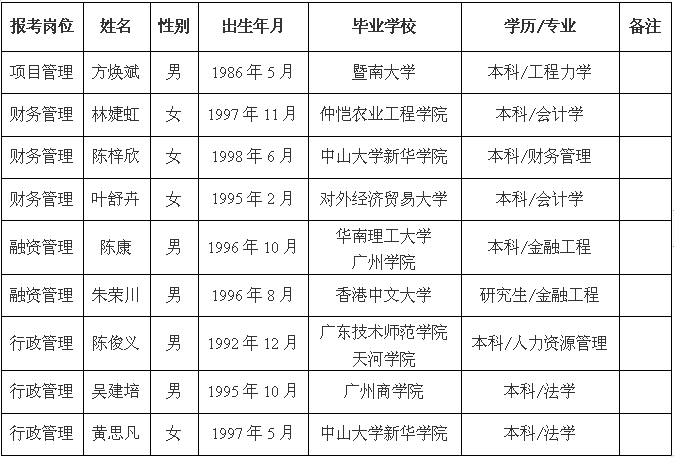 根據(jù)揭陽市投資控股集團有限公司的委托,我公司經(jīng)組織報名、資格審查、筆試、面試、體檢、政審等程序,現(xiàn)確定下列人員為揭陽市投資控股集團有限公司擬聘用人員并公示如下:
