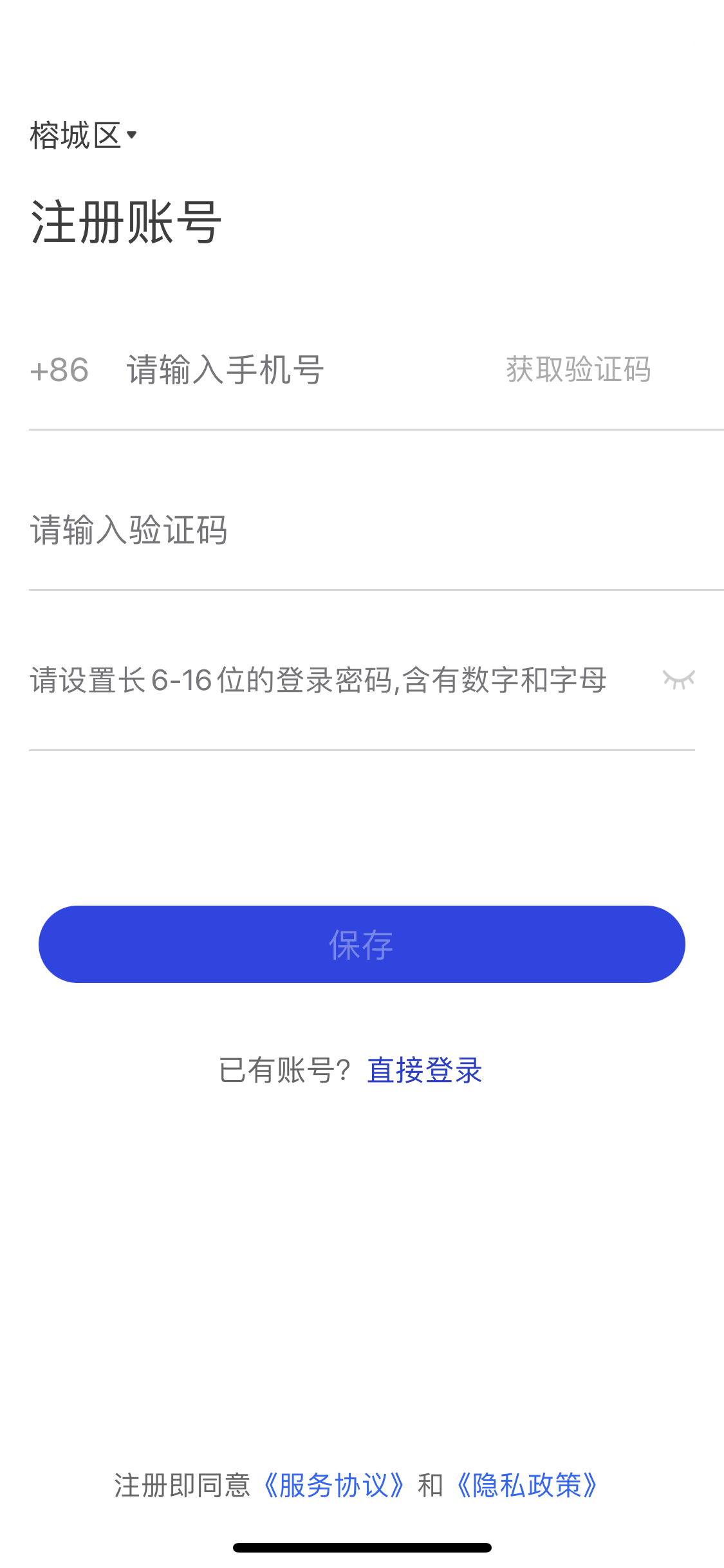 2、進(jìn)入APP后,首先選擇常駐地區(qū)完成注冊(cè),然后進(jìn)入登錄頁面,點(diǎn)擊“快速注冊(cè)”。完善個(gè)人賬號(hào)信息后并保存。
